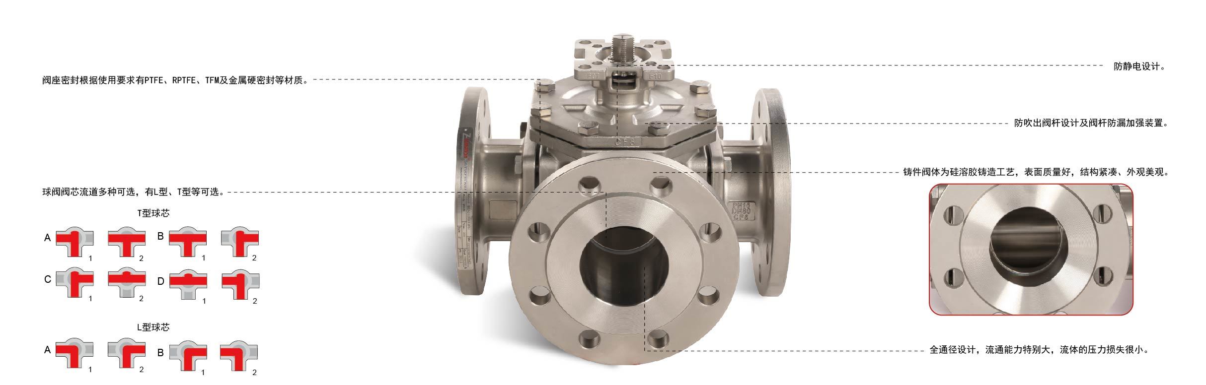 BU/BV系列三通球阀适用于管道需要流向转换或循环工作而设计研发,实现快速启闭和切换流向作用。根据不同需求,可提供L型球体、T型球体。