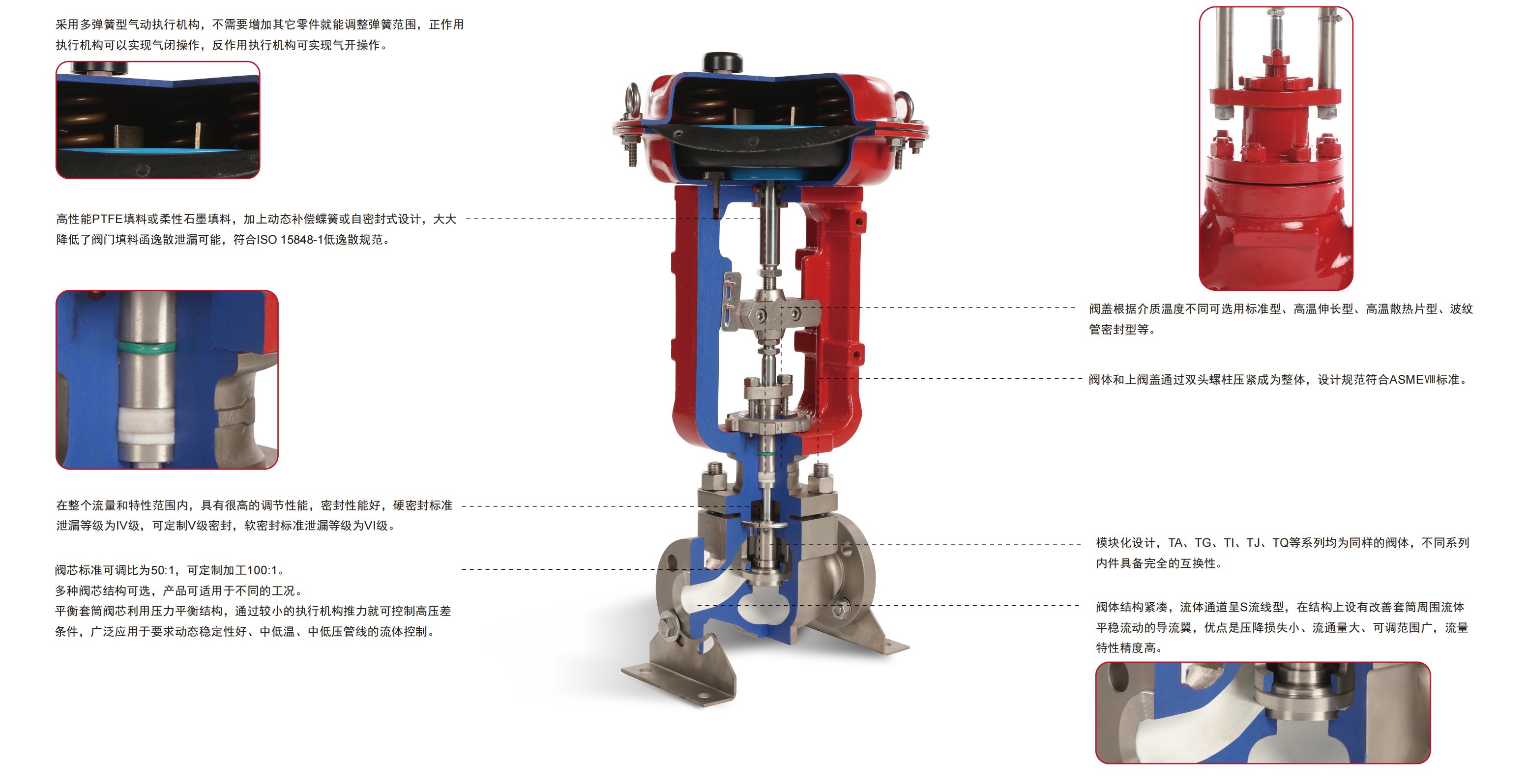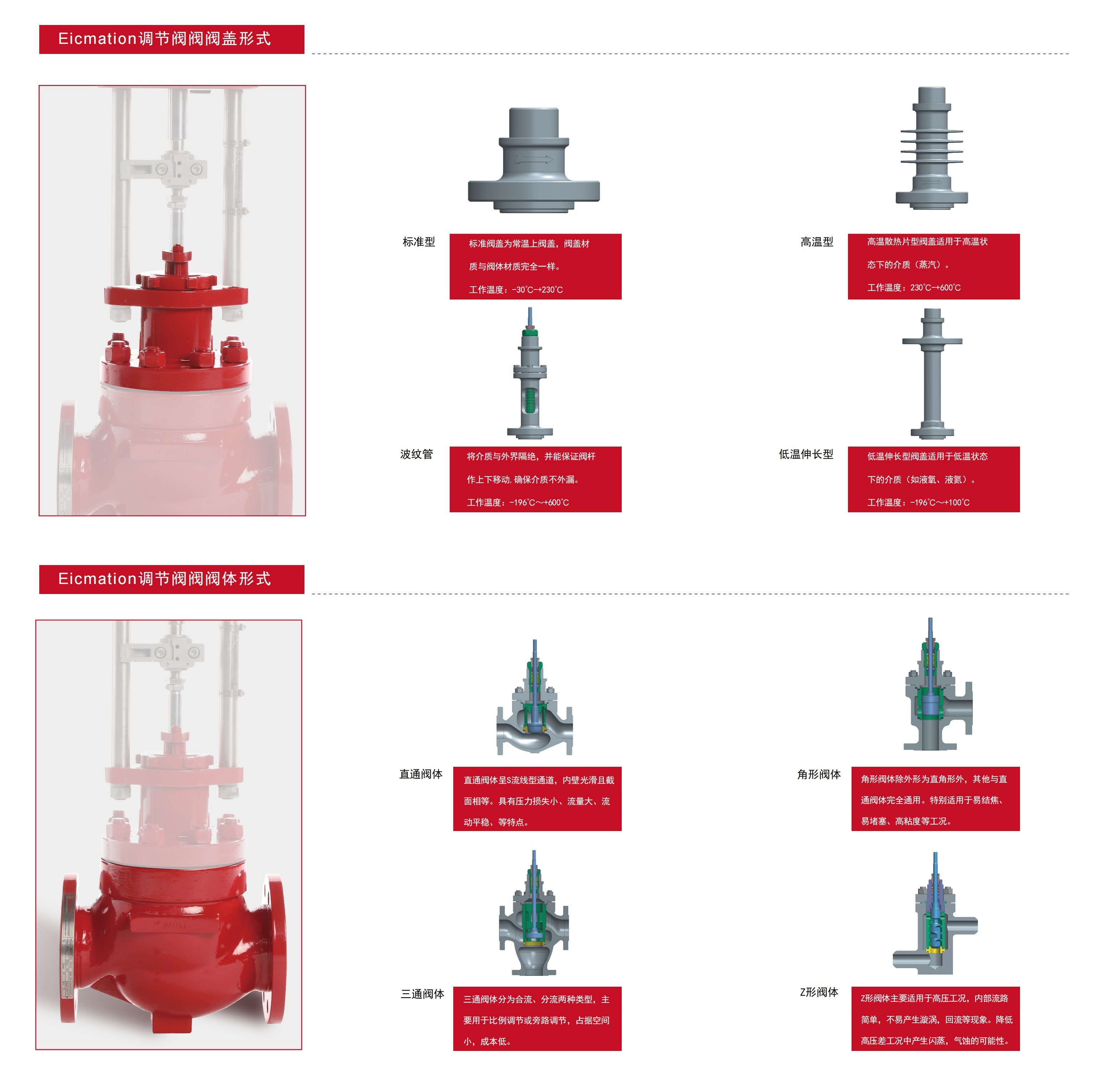 T系列调节阀是一种球形阀,是过程控制中最常用、最可靠的产品,品种、结构多样,适用于各类不同的工况。EICMATION的T系列调节阀采用模块化设计,不同的结构形式具有互换性,极大降低了客户现场后期的维护成本。目前T系列调节阀主要有两类结构:TA系列不平衡单座调节阀和TG系列平衡套筒单座调节阀。