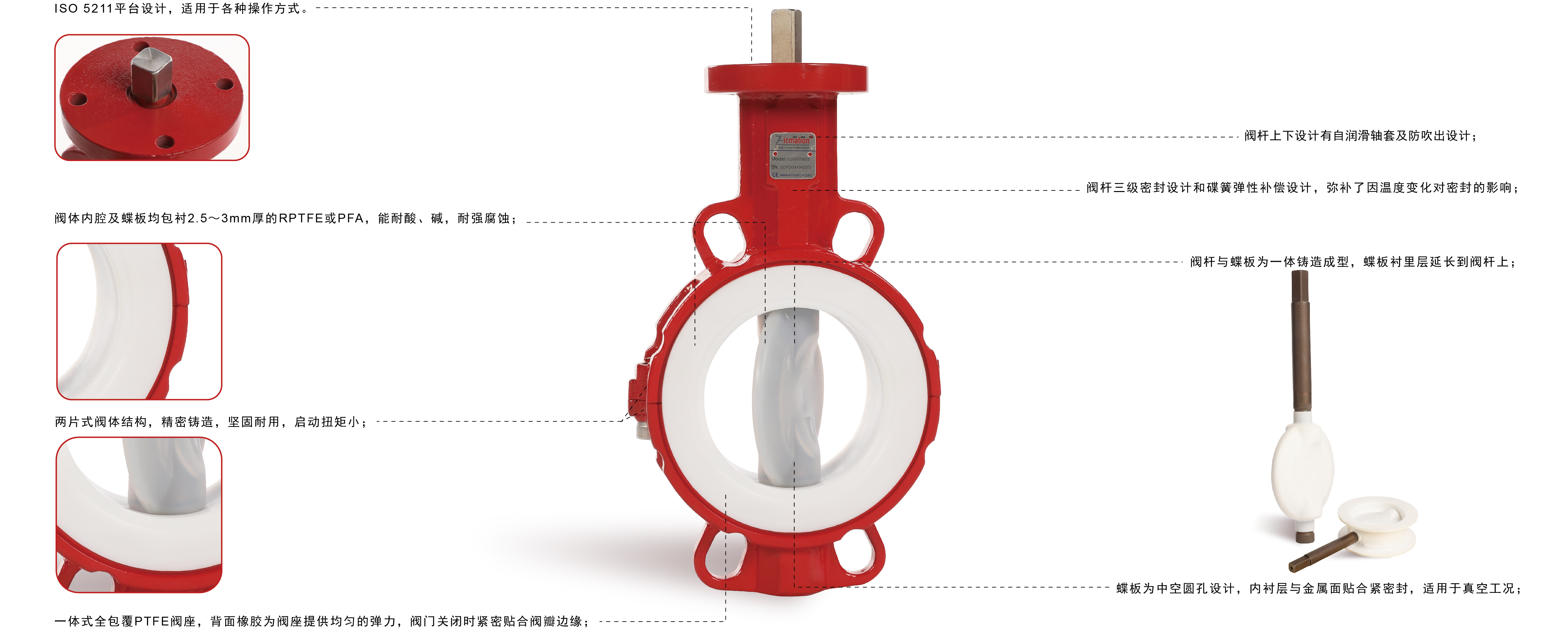 • FD/FE系列内衬蝶阀是采用中线型密封结构的软密封蝶阀,该阀内腔及蝶板均采用高压注塑工艺衬有耐腐蚀、耐老化的氟塑料FEP或RPTFE或PFA,具有可靠的耐腐蚀性和密封性。